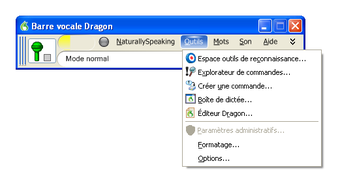 Après la phase d'entraînement, Dragon NaturallySpeaking est plutôt simple à utiliser. L'interface se concentre en une petite barre (la barre Dragon) où sont accessibles les principales fonctionnalités: boîte de dictée, lecture à voix haute, amélioration de la reconnaissance, explorateur de commandes et enrichissement de vocabulaire, etc.